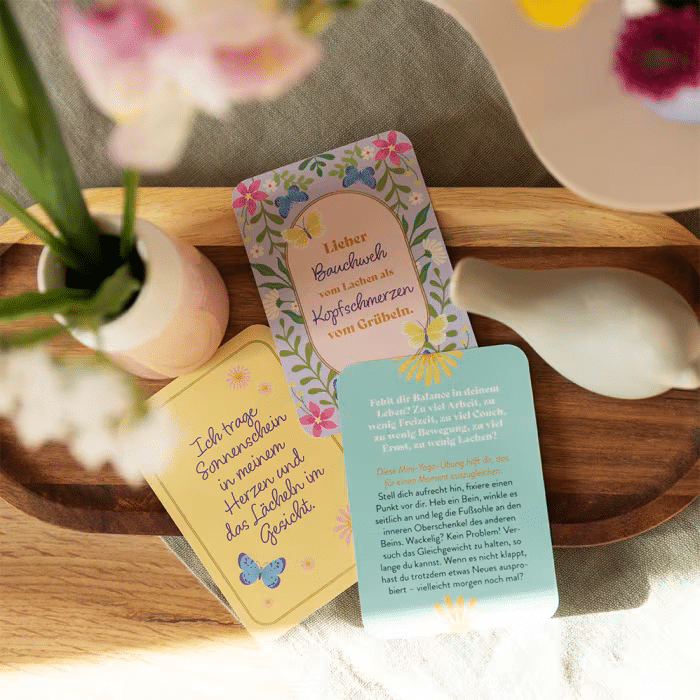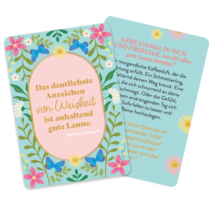 Gute Laune ist ansteckend und lässt uns beschwingt durchs Leben tanzen. Denn wer lächelt, tut nicht nur seiner Haltung, sondern auch seinem Herzen etwas Gutes. Entdecke jeden Tag ein kleines Stück vom Glück mit diesen inspirierenden Karten! Die hochwertige Kartenbox im handlichen Format mit 50 Impulsen, Zitaten und Anregungen sorgt für mehr Lebensfreude im Alltag – immer und überall!