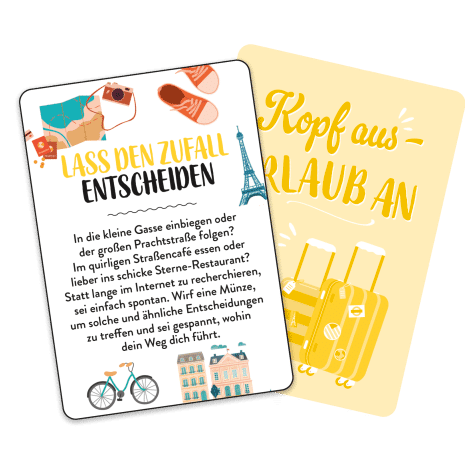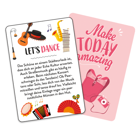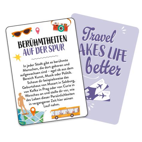 Die 50 unterhaltsamen Challenges in diesem handlichen Kartenset garantieren dir unvergessliche Geschichten und Erinnerungen für deinen nächsten Kurztrip! Sing ein Lied in der Landessprache beim Karaoke, schenke Einheimischen einfach so Blumen oder versuche durch Tauschgeschäfte ein Haus in deiner Traumstadt zu ergattern. Dieses Reisespiel für unterwegs bietet eine perfekte Mischung aus Spaß und Abenteuer, das dir eine unvergessliche Zeit bescheren wird. Durch das handliche Kartenspiel-Format passen sie in jede Tasche oder Rucksack und sind so der ideale Begleiter bei der nächsten Stadterkundung – ganz egal, ob du alleine reist, zu zweit oder als Gruppe.