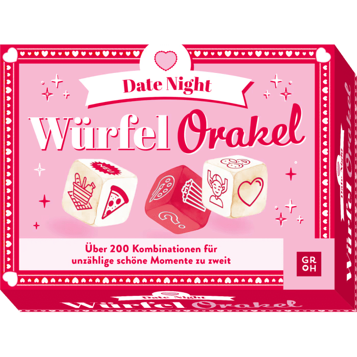 Du brauchst neue Inspiration für schöne Dates mit deiner Partnerin oder deinem Partner? Dann lass dich von diesem Spiel für Erwachsene und Jugendliche mit tollen Ideen versorgen. Die handliche Spielebox enthält drei Würfel, mit jeweils 6 Anregungen für Kulinarisches, 6 Ideen für Aktivitäten und 6 Anleitungen fürs Näherkommen. Das ergibt 216 mögliche Kombinationen: Euch wird also garantiert so schnell nicht langweilig. Im beigelegten Booklet gibt es zu jedem Würfelmotiv eine Bandbreite an Vorschlägen, die ihr eurem Budget, eurer Zeit und eurer Laune anpassen könnt.