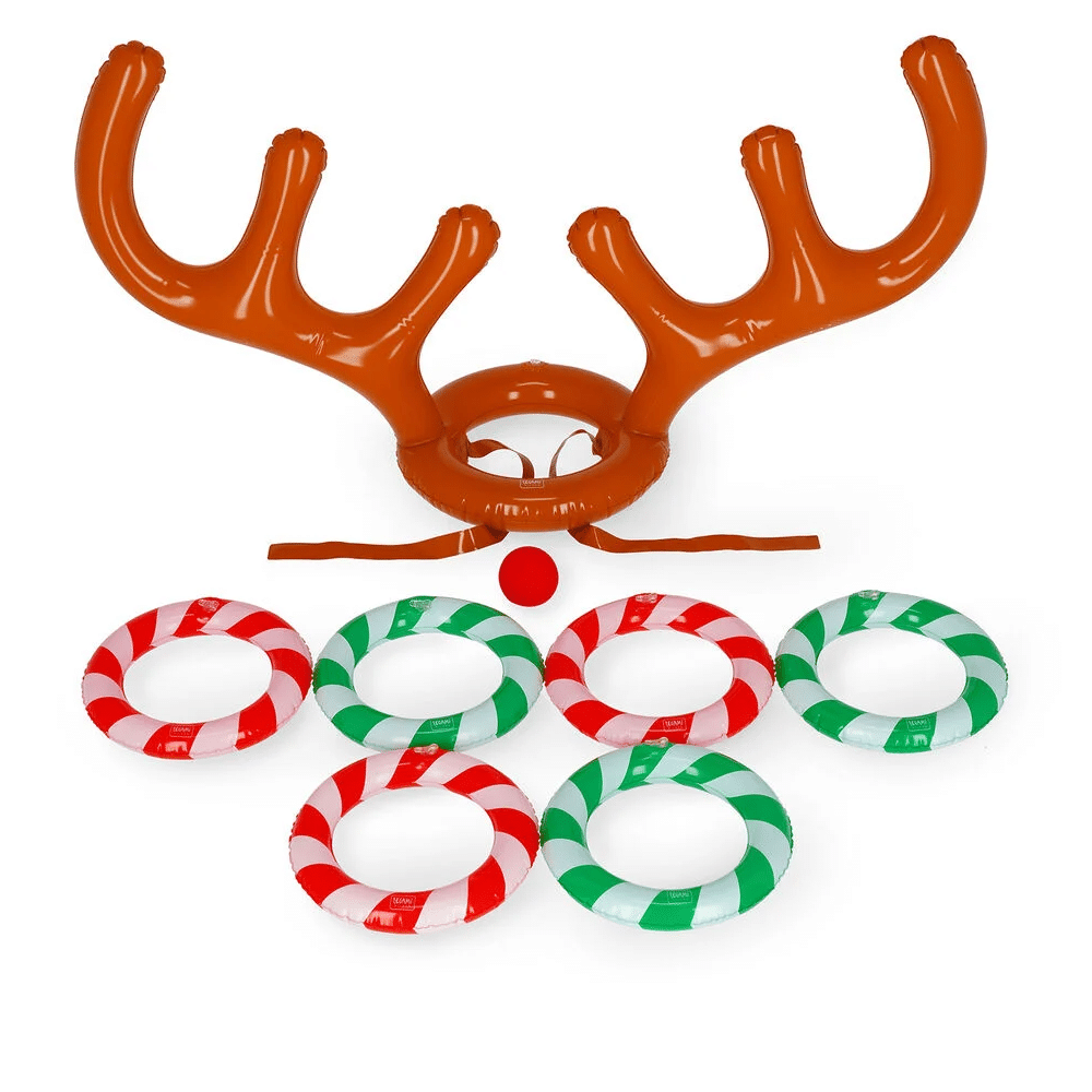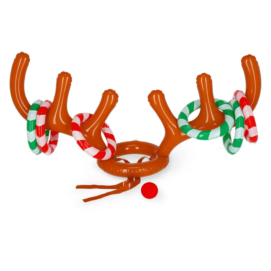 Enthält: 1 Paar aufblasbare Rentierhörner; 6 aufblasbare Ringe in 2 verschiedenen Farben; 1 rote Rentiernase
