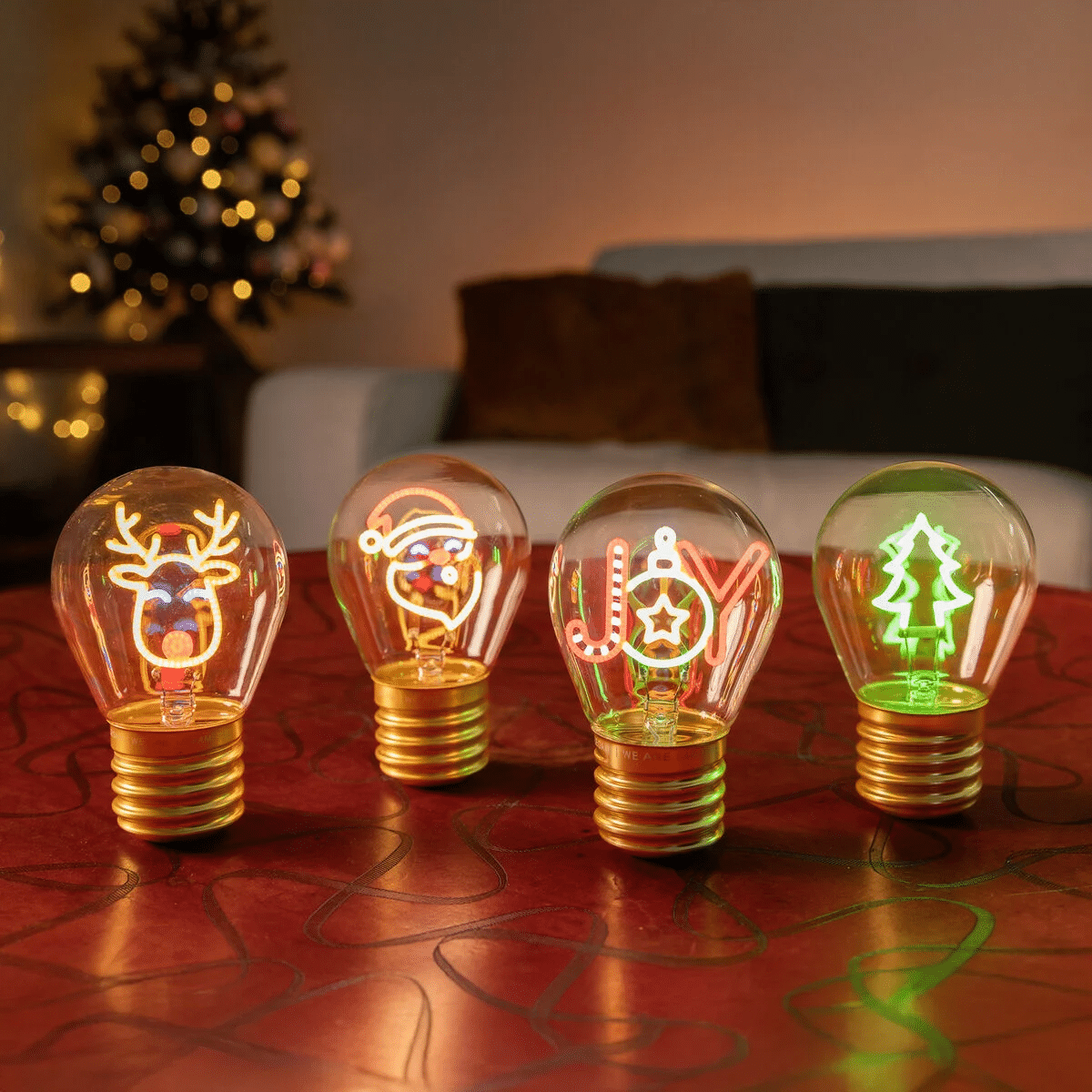 Einfach aufladen, einschalten und schon bringt die leuchtende Glühbirnenform Weihnachtsstimmung in dein Zuhause.