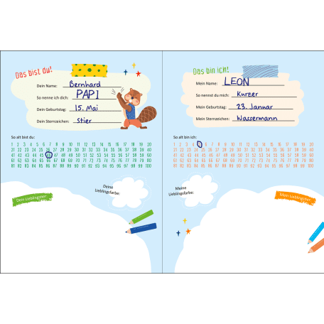- Mit Seiten zum Ausfüllen z.B. Das mag ich besonders an dir, mit Seiten zum Malen und Basteln, z.B. mein Handabdruck + dein Handabdruck und viel Platz für Fotos