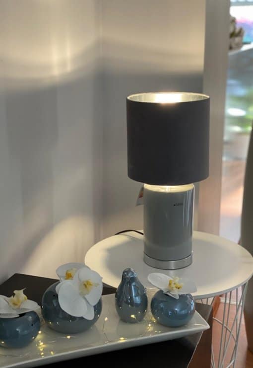 Die Deko Lampe grau bildet durch ihr zartes Grau einen schönen Kontrast zu unserer typischen Tiziano Keramik in cremeweiß. Der Fuß besteht aus Keramik und ist zylinderförmig. Ein silberner Metallring am Boden sorgt für einen extra Hingucker. Der Schirm ist ebenfalls Grau, allerdings aus Samt und Innen verspiegelt.