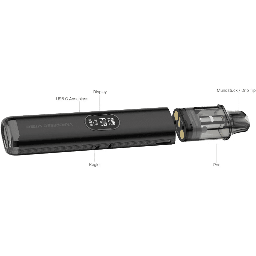 Wesentliche Komponenten des Vibe E-Zigaretten-Sets von Vaporesso sind der gleichnamige Akku mit einer Kapazität von 1.100 mAh sowie der Vibe Dual Mesh Pod mit einem Tankvolumen von 4,5 Millilitern. Die Vibe E-Zigarette kann in den beiden Ausgabemodi ECO oder Power betrieben werden. In Abhängigkeit vom gewählten Betriebsmodus liegt der Widerstand am Verdampfer bei 0,8 bzw. 0,6 Ohm, womit das Device für das moderate Dampfen vom Mund zur Lunge optimiert ist, im Power-Mode aber auch restriktive Züge direkt in die Lunge unterstützt. Das Gerät wird intuitiv auf Zug am Mundstück aktiviert. Ein integriertes 0,54” OLED-Display informiert Sie über betriebliche Parameter wie die momentane Ausgangsleistung, den gewählten Betriebsmodus oder den aktuellen Ladestand des internen Akkus. Mit bis zu einem Ampere Ladestrom kann dieser über den Type C-USB-Port beschleunigt und optimiert mit frischer Energie versorgt werden. Bitte beachten Sie, dass ein Ladekabel nicht zum Lieferumfang des Sets gehört, bei Bedarf jedoch hier in unserem Shop als optionaler Zubehörartikel erworben werden kann. Durch einfaches Zusammenstecken wird der Vibe Dual Mesh Pod mit dem Housing des Akkus verbunden.
